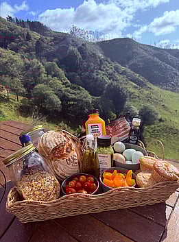 A delicious, cooked breakfast featuring eggs and bacon, fresh toast, and a side of seasonal produce – best enjoyed on the deck with a view of Kāpiti Island.
